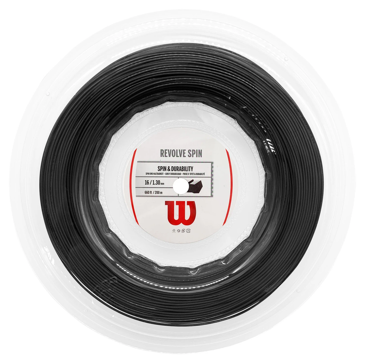 Wilson Revolve Spin 16 1.30mm 200M Reel strings approximately 18 racquets.